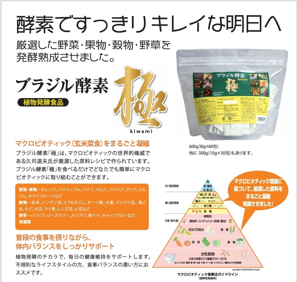 健康と美をサポートする「ブラジル酵素 極」は、マクロビオティックの世界的権威である久司道夫氏監修のもと、80種類の厳選されたブラジルの野菜、果物を含め、穀物、海藻等を発酵させた贅沢な酵素食品です。スティック状の食べきりサイズで旅行先への持ち運びもOK!スティック1本の中に自然の恵みをギュッと詰め込んだこの酵素は、食事のバランスをとるのが難しい現代人の栄養サポートにオススメです。