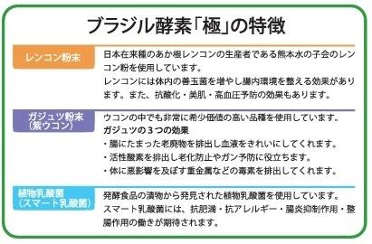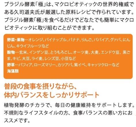 健康と美をサポートする「ブラジル酵素 極」は、マクロビオティックの世界的権威である久司道夫氏監修のもと、80種類の厳選されたブラジルの野菜、果物を含め、穀物、海藻等を発酵させた贅沢な酵素食品です。スティック状の食べきりサイズで旅行先への持ち運びもOK!スティック1本の中に自然の恵みをギュッと詰め込んだこの酵素は、食事のバランスをとるのが難しい現代人の栄養サポートにオススメです。